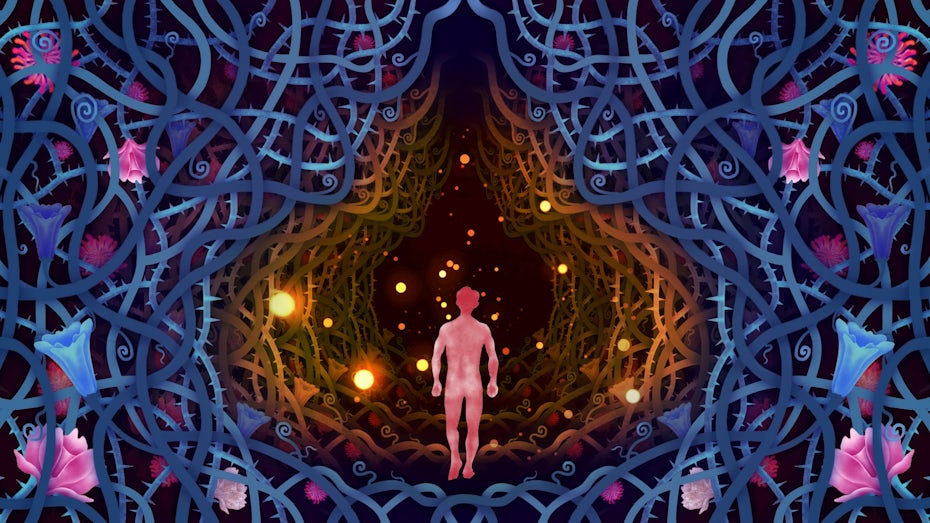 While psychedelia often takes its inspiration from nature (consider the multicolored clouds and melting mushrooms in many such compositions), space psychedelia is about marrying the future and the past. It features 90s retro techniques like Memphis Design patterns, Saturday morning cartoon styles and colors reminiscent of Lisa Frank school supplies. And it mixes in futuristic themes, like androids and spaceships, vaporwave landscapes, simulated environments and cyberpunk neon. With these bright, imaginative illustrations, the designers of 2023 are looking to the technological future with optimism.